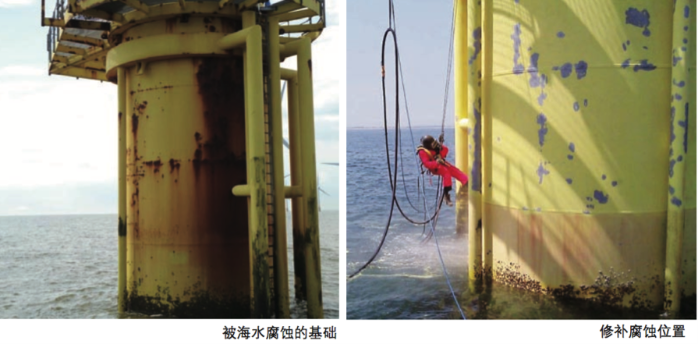避免腐蝕的另一種常用方法是在鋼結(jié)構(gòu)表面施以由環(huán)氧樹脂構(gòu)成的防腐涂層來(lái)隔絕海水。目前,海上風(fēng)電的防腐常將這兩種方法結(jié)合起來(lái),在涂料中加入大量鋅粉或鋁粉,成為犧牲陽(yáng)極。一旦涂層的阻隔作用削弱,就用犧牲陽(yáng)極來(lái)保護(hù)。