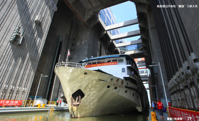 盛水承船廂是運(yùn)載船舶升降過壩的載體。3.5米標(biāo)準(zhǔn)運(yùn)行水深的承船廂總重是1.55萬噸,根據(jù)阿基米德定律,船只駛?cè)氤写瑤麜懦鐾戎亓康乃?承船廂依舊保持在1.55萬噸。由于運(yùn)用物理學(xué)平衡原理在船廂兩側(cè)設(shè)置了同等質(zhì)量的配重,提升或者放下承船廂,驅(qū)動機(jī)構(gòu)僅需克服不平衡質(zhì)量和運(yùn)動阻力(約提升400噸左右重量的力,相當(dāng)于承船廂總重的2.5%左右),船廂即可輕松升降。