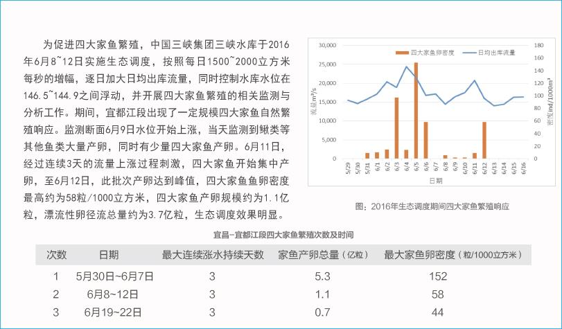 2017年,三峽水庫(kù)實(shí)施了兩次針對(duì)四大家魚自然繁殖的生態(tài)調(diào)度,調(diào)度期間宜都江段四大家魚繁殖規(guī)模達(dá)到10.8億顆。2011-2017年四大家魚年均自然繁殖產(chǎn)卵規(guī)模較2010年增加15倍,長(zhǎng)江中下游其他小型魚類自然繁殖規(guī)模也大幅增加,調(diào)度效果顯著,有效促進(jìn)長(zhǎng)江中下游魚類種群資源的恢復(fù),推動(dòng)長(zhǎng)江水生生態(tài)系統(tǒng)健康發(fā)展。2016-2017年,中華鱘研究所將環(huán)境DNA技術(shù)應(yīng)用于四大家魚繁殖監(jiān)測(cè)工作中,使產(chǎn)卵場(chǎng)定位更加精準(zhǔn),提高對(duì)自然繁殖規(guī)律的認(rèn)識(shí)。