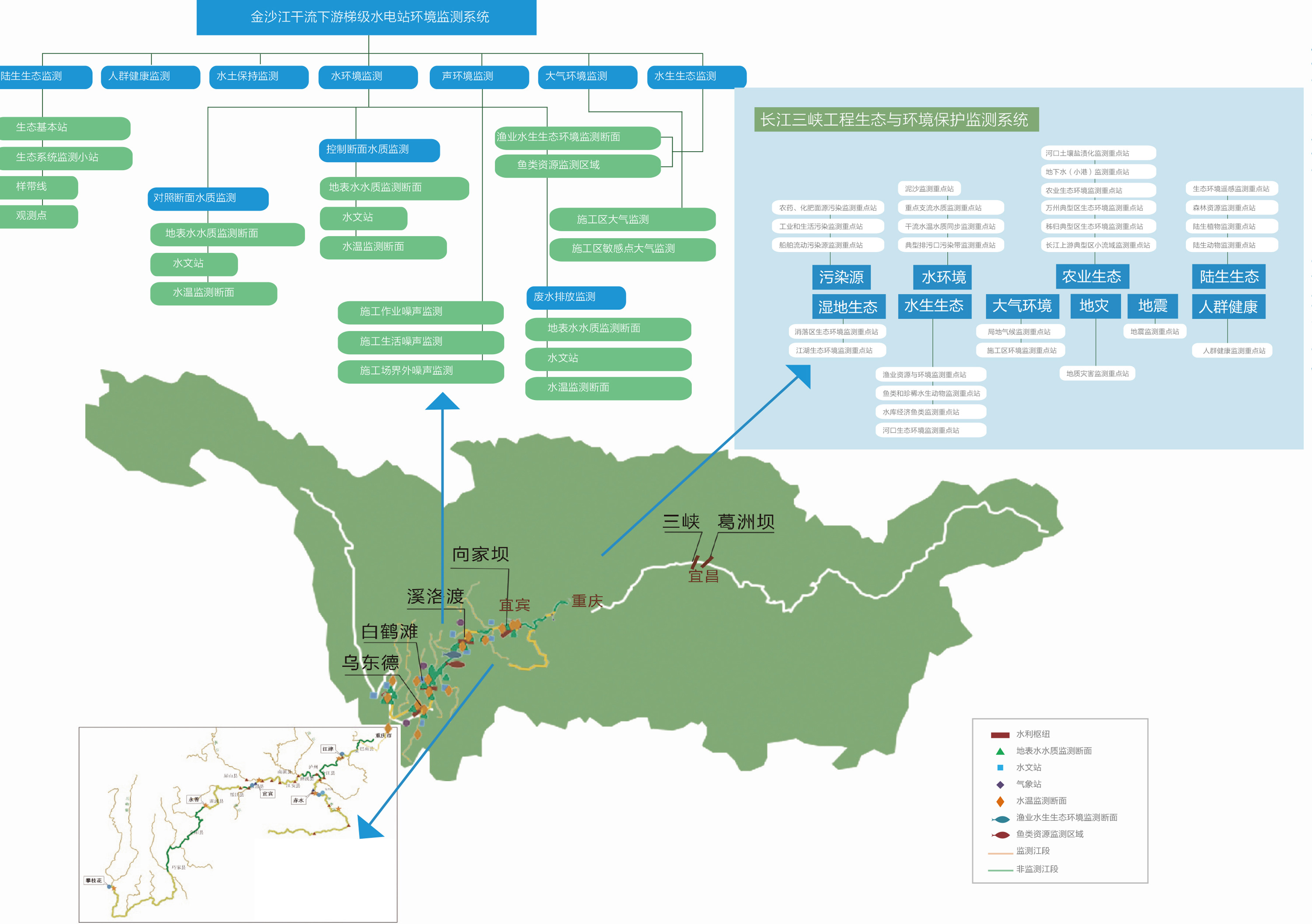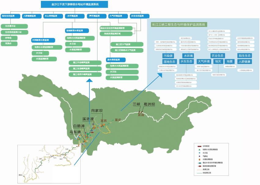 金沙江干流下游流域生態(tài)環(huán)境監(jiān)測(cè)系統(tǒng)。結(jié)合流域生態(tài)環(huán)境變化和開發(fā)建設(shè)實(shí)際情況,有序?qū)嵤┙鹕辰掠瘟饔蛏鷳B(tài)環(huán)境監(jiān)測(cè),包含流域水質(zhì)監(jiān)測(cè)、水生生態(tài)監(jiān)測(cè)、陸生生態(tài)監(jiān)測(cè)、長(zhǎng)江攀枝花-宜昌江段水溫監(jiān)測(cè)、流域過飽和氣體監(jiān)測(cè)等。